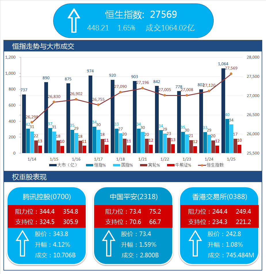 港股周五(25日)高开161点后, 升幅一度收窄至96点,全日低见27217点。随着资金不断涌入腾讯900700)及内银股,内房股也受惠人行提高流动性而获追捧,港股反复向上,最终更以全日最高位收市,报27569点,升448点。国企指数报10873,升182点。