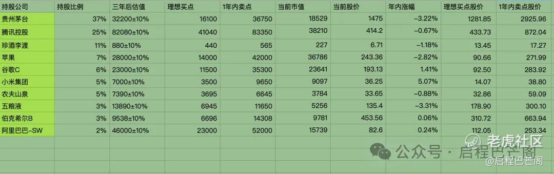 目前十大持仓:贵州茅台37%,腾讯25%,珍酒李渡11%,苹果7%,谷歌6%,小米集团5%,农夫山泉5%,五粮液3%,伯克希尔3%,阿里巴巴2%。目前九大持仓占比88%(其中科技股占比45%,白酒股占比51%;A股占比40%,港股占比48%,美股占比16%),还有12%观察仓仓位。