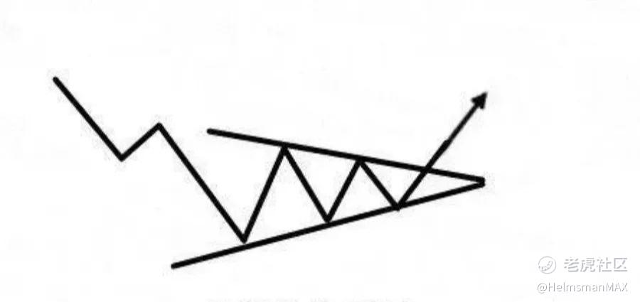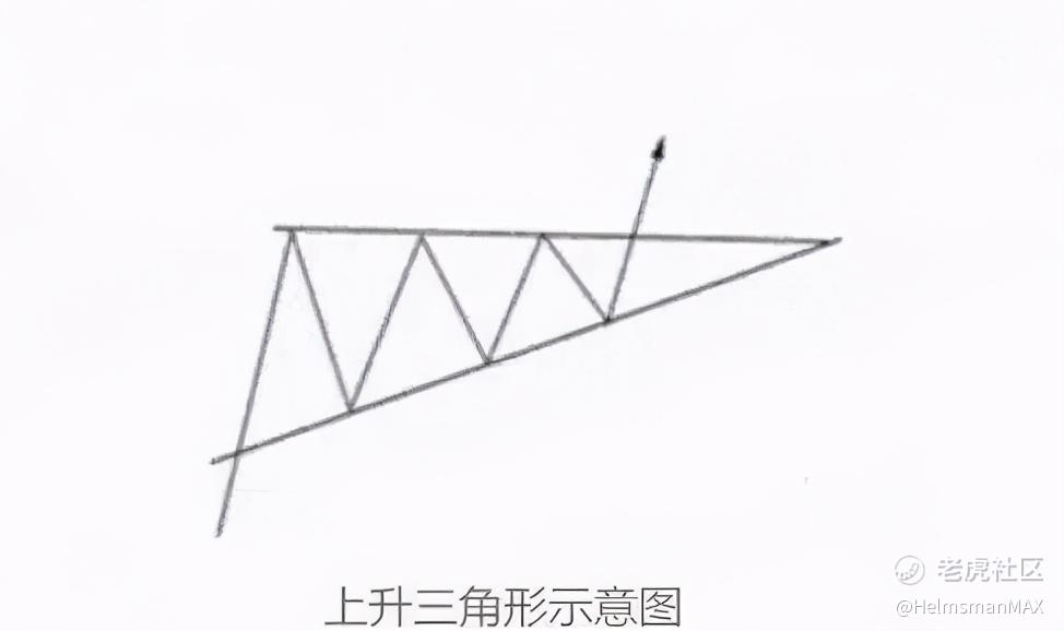 此种图形也是出现在上涨的过程中,当价格从上涨过程中突然出现窄幅的波动,而且每次上涨的最高点基本相近,而最低点却依次上涨时,如果将最高点和最低点分别用直线相连,就形成了一个三角形形态。这个三角形的特点是上边线是水平的,下边线是向上倾斜的。