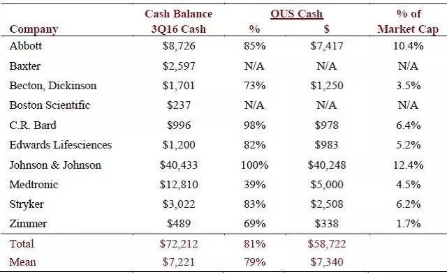 比方说Becton Dickinson (BDX);以及那些研发能力很强的生物制药公司,因为一旦跨国公司有钱在手上就会想去买买买。下图展现主要大的医疗器械公司的海外现金余额,数据来源于JPMorgan.