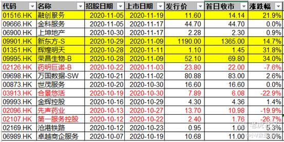 10月后招股的共15家公司,首日破发4只(27%),涨幅在10%以下的7只(47%),涨幅10%以上的仅有4只(26%),新东方属于二次上市,如果把它剔除,那就只有3只有好表现,另外,融创服务也是暗盘破发,然后首日走出漂亮行情,要赚这个钱还要求暗盘日能扛住。