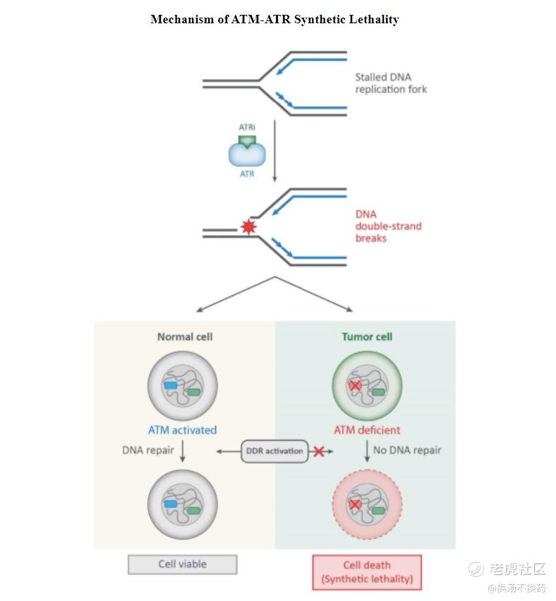 ATR是一种蛋白激酶,作用于损伤修复系统(DDR)的多个层次,ATM负责检测DNA双链断裂,Repare通过SNIPRx平台证实,存在ATM缺陷的细胞依赖ATR的活性生存,因此ATR与ATM是一对合成致死基因。ATR的抑制可以破坏DNA复制的稳定性,并使DNA的双链断裂增加,而正常细 胞的DNA双链断裂通常可以被ATM检测到并发出修复信号,但存在ATM缺陷的肿瘤细胞对DNA断裂的反应受损,这使得ATM缺陷的癌细胞对ATR抑制剂的杀伤高度敏感。