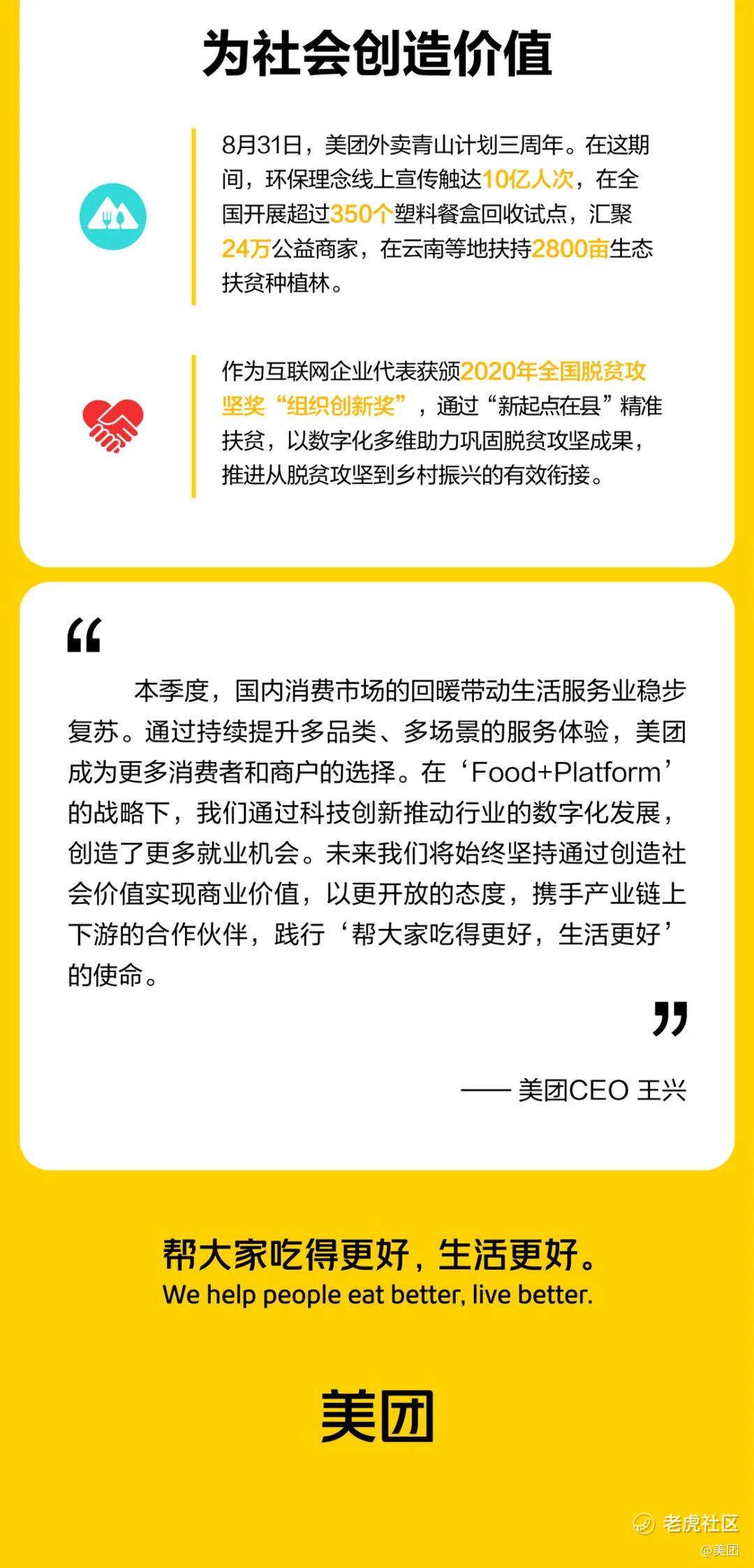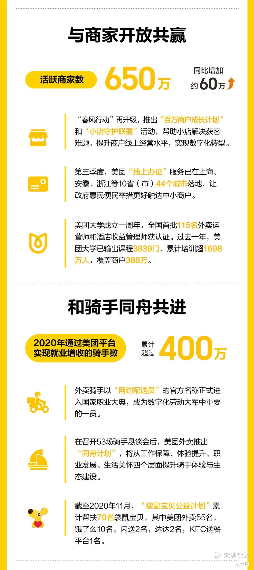11月30日,美团发布2020年第三季度业绩。得益于中国经济的强大韧性和活力,本季度公司各板块业务全面收获正增长,整体营收同比增长28.8%至354亿元,经调净利润为21亿元。其中,年度活跃商户数增长至650万,年度交易用户数达4.8亿创新高,体现了生活服务数字化带来的供需两端的快速增长。