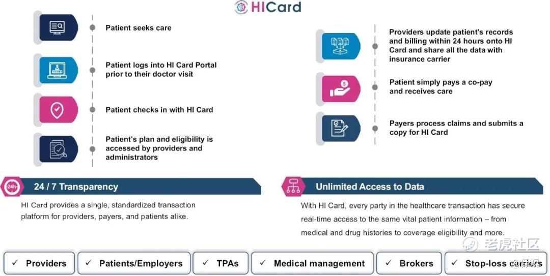 SMR是专门为小型企业提供定制自筹资金福利计划的项目经理,设计健康计划、选择网络、管理供应商并在市场上设置福利计划,包括福利结构、保险范围选项和提供商网络。ICE是一家MGU,专门为止损承保人承保并提供管理功能。HI Card致力于通过一个平台使用一次登录简化医疗记录和索赔管理。