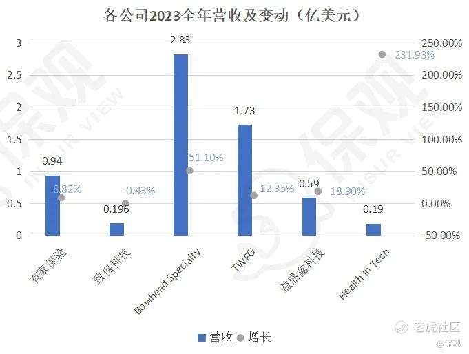 其他公司中,Bowhead Specialty实现了2.83亿美元的营收,同比激增51.1%。TWFG则以1.73亿美元的营收排名第三,同比增长12.35%。作为国内科技保险的代表,致保科技实现了0.196亿美元的营收,但同比微降0.43%。有家保险的营收为0.94亿美元,增长率达8.82%。