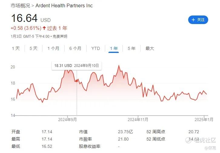 上市以来,Ardent Health股价有涨有跌,从首个交易日至8月1日波动上涨,达到约18美元的小高峰;此后,股价波动下跌,于8月9日跌至15.64美元的低谷;这之后,股价再次波动上涨,并于8月30日达到约20美元的第二高点;在10月中旬之前,股价经过两次下跌、两次上涨,于10月16日达到20.16美元的最高峰;这之后的一个月,股价波动下跌,并于11月下旬开始回升,12月31日为17.08美元,较发行价略高。