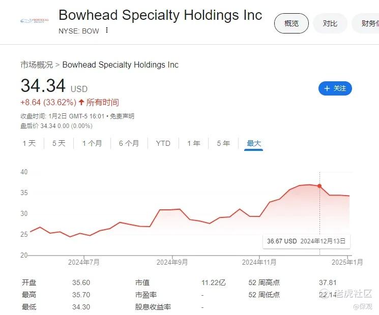上市至2024年底,Bowhead Specialty股价波动走高,从5月24日至8月中旬,股价从25.7美元波动小幅上升,在8月16日为26.95美元;8月16日至12月6日,股价一路波动上涨,在12月6日达37美元;12月20日至年底,股价波动下滑,在年底略有抬头迹象。按照美东时间1月2日下午的股价计算,该公司的市值约为11.22亿。