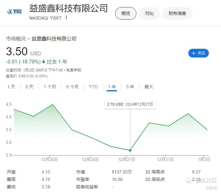 截止2024年12月31日,于年底上市的保险科技公司益盛鑫网络科技股价也有所下跌。2024年12月18日,益盛鑫科技成功在美国纳斯达克上市,以每股4元发售125万股,募资500万美元。