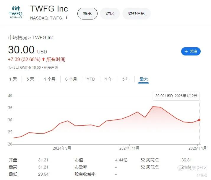 自上市到2024年底,TWFG股价同样波动上涨。从7月中旬到11月底,TWFG的股价从约22美元左右上升至35美元左右;这之后到12月27日,股价逐渐下跌至约29美元,此后在年底略有上扬。按照美东时间1月2日下午的股价计算,TWFG市值约为4.44亿美元。