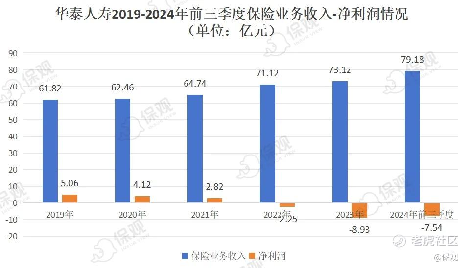 2024年前三季度,华泰实现保险业务收入79.18亿元,同比增长31.75%,保费收入表现较为稳健。然而,在净利润方面,前三季度该司累计亏损超过7.54亿元,较去年同期下滑了271.4%。