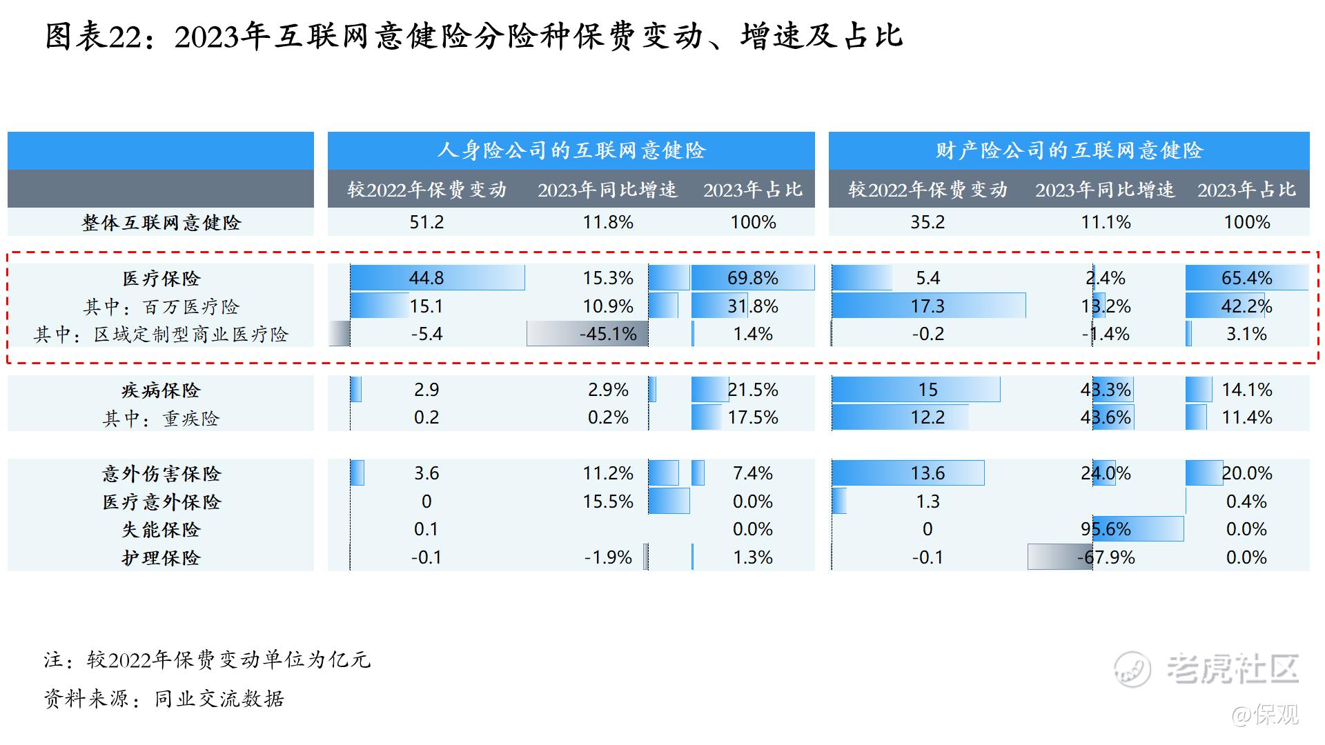 《报告》重点对人身险公司和财产险公司的互联网意健险进行整合分析。规模增速层面,2022年互联网意健险保费受政策和市场环境影响,首次出现下降,降幅达到17.5%。2023年则恢复至两位数的增速。分险种来看,医疗险在互联网意健险中的占比接近七成,是主要增长的险种。此外,互联网医疗意外险、失能保险和护理保险合计规模占比仍不足1%,销售空间有待进一步探索。