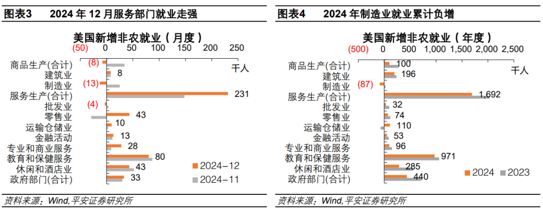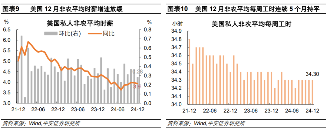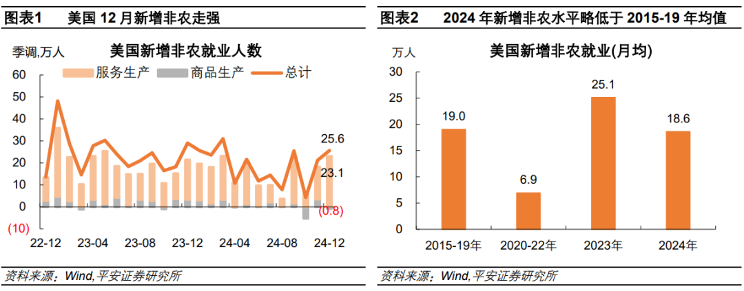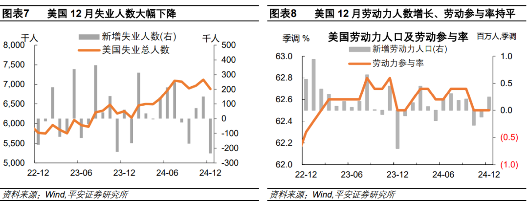 其他就业数据喜多于忧。职位空缺方面,美国11月职位空缺数超预期回升,职位空缺数与失业人数比值也小幅回升(1.14),但仍低于2019年均值(1.19)。“小非农”方面,12月ADP私人部门新增就业人数为12.2万人,预期为14万人,修正后的前值为14.6万人,连续第2个月下降。PMI分项方面,美国ISM制造业和服务业PMI就业分项延续分化,与非农行业表现基本吻合。周度失业人数方面,最新初请失业金人数意外走低,增添了市场对“强就业”的紧张感。美国截至1月4日当周初请失业人数录得20.1万人,低于预期的21.5万人。截至12月28日当周,续请失业金人数为186.7万人,高于2024年中枢水平的184万人左右。