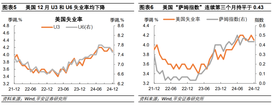 12月失业率意外下降,同时受益于失业人数减少和劳动力人口增长。美国12月U3失业率为4.1%,低于预期和前值的4.2%;U6失业率(包括所有勉强算作劳动人口的人员以及因经济理由兼职就业的总人口)录得7.5%,低于前值的7.7%,创6月以来新低。基于U3失业率测算的“萨姆指数”(美国失业率的3个月移动平均值-前12个月的3个月滚动移动平均值)连续第三个月持平于0.43,低于0.5警戒线。U3失业率走低,同时受益于失业人数(分子)下降和劳动力人口(分母)增长。12月失业人数环比下降23.5万人,劳动力人口(分母)环比增长24.3万人,劳动参与率连续第三个月持平于62.5%。