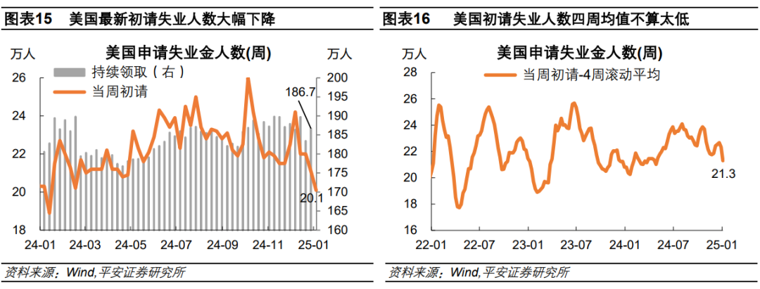 周度失业人数方面,最新初请失业金人数意外走低,增添了市场对“强就业”的紧张感。美国截至1月4日当周初请失业人数录得20.1万人,低于预期的21.5万人;四周均值为21.3万人,不算太低。截至12月28日当周,续请失业金人数较前值增加了3.3万人,达到186.7万人,高于2024年中枢水平的184万人左右。不过,最新初请失业人数走低可能为下一期续请失业人数的下降做铺垫。