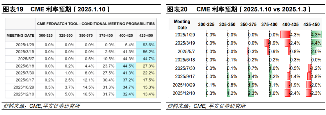 市场对2025年一季度降息更加不抱希望,全年降息前景更加看不清。CME数据显示,截至1月10日,对于2025年6月以前的会议,市场进一步降低了原本就不高的降息预期;但对6月以后的降息判断分歧加大,年内平均降息预期为39BP(1-2次),但一些人加大了降息75BP(3次)的押注,可能担心美联储上半年过度紧缩、加大下半年经济下行风险。