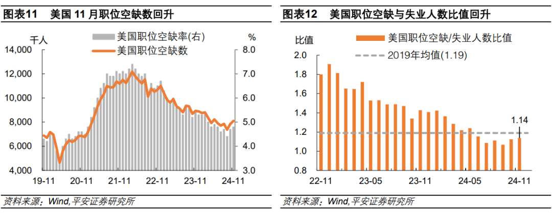 美国11月职位空缺数超预期回升,职位空缺数与失业人数比值也小幅回升,但仍低于2019年均值。2025年1月7日公布的数据显示,美国2024年11月职位空缺809.8万人,明显高于预期的774万人,也高于小幅上修后的前值783.9万人,连续第2个月回升。12月职位空缺率4.8%,高于前值的4.7%。美联储关注的指标——职位空缺与失业人数比值,在11月录得1.14,小幅高于前值的1.12,但自6月以来持续低于2019年均值的1.19,说明尽管职位空缺数有所回升,但劳动力需求较疫情前仍不算充裕。