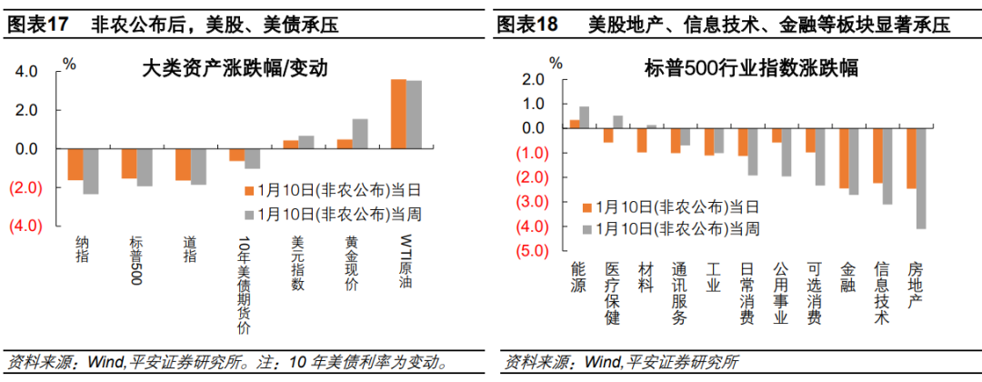 1月10日非农数据令市场“紧缩恐慌”延续:美股美债同时承压,美元、黄金小幅走强,原油大涨。1月10日,美股三大指数当日均收跌1.5%以上,纳指整周收跌超2%;美股地产、信息技术、金融等板块显著承压,能源逆势上涨。10年美债收益率当日上升9BP、整周累升17BP至4.77%,刷新2023年11月(近一年)以来新高。美元指数当日升0.44%、整周累升0.68%至109.66,刷新2022年11月(近两年)以来新高。1月10日当日和当周,大类资产表现方向基本一致,主要体现就业市场走强引发的美联储“少降息”甚至“不降息”的担忧。