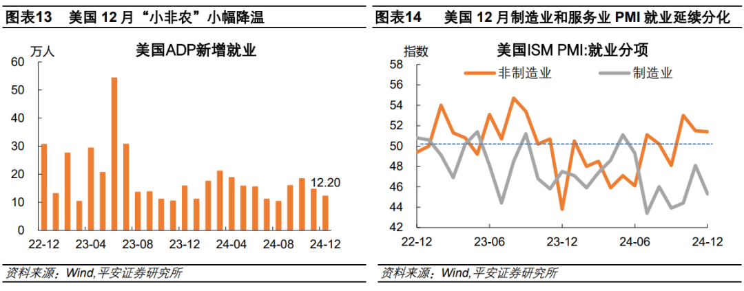 “小非农”方面,2025年1月8日公布的数据显示,美国2024年12月ADP私人部门新增就业人数为12.2万人,预期为14万人,修正后的前值为14.6万人,连续第2个月下降。值得注意的是,10月新增ADP就业人数曾高达18.4万人,而新增非农仅4.3万人,说明ADP对于飓风等影响的敏感程度不如非农;尽管11-12月ADP就业“跑输”非农,但四季度平均水平来看,ADP与非农差距不大。