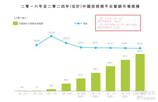 根据艾瑞咨询报告在中国短视频平台投放广告产生的收入由二零 一六年的人民币8亿元增加至二零一九年的人民币800亿 元,复合年增长率364.2%, 并预期由二零二零年的人民币1,335亿元进一步增加至二零二四年的人民币3,950亿元,复合年增长率为31.2%。