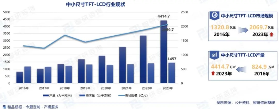 数据显示,2023年中国中小尺寸TFT-LCD面板的产量达到4414.7万平方米,需求量为1457万平方米,其中玻璃面板在供应链中呈现供大于求的状态,显示出市场需求的相对稳定。