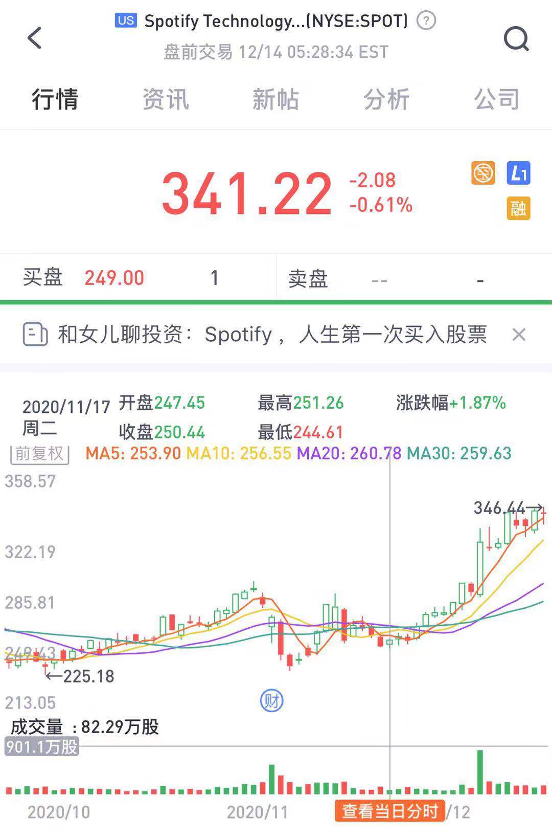 “唔…, 让我来看看啊”。我拿出手机,找出Spotify的价格走势,转给她看。