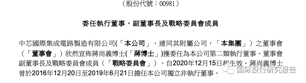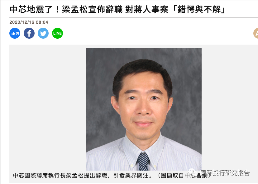 中芯地震了!中芯國際昨召開臨時董事會,會後公告與宣佈由蔣尚義出任公司第二類執行董事、董事會副董事長及戰略委員會成員,即日起生效,但也引爆中芯國際聯席執行長梁孟松向董事會提出辭職,梁孟松覺得對蔣尚義出任中芯國際副董事長一職,12月9日才被告知,他感到非常的「錯愕與不解」,覺得「已經不再被尊重與不被信任」,認為已不再需要他繼續為中芯前景打拼奮鬥了。梁的辭職聲明引發半導體業關注。