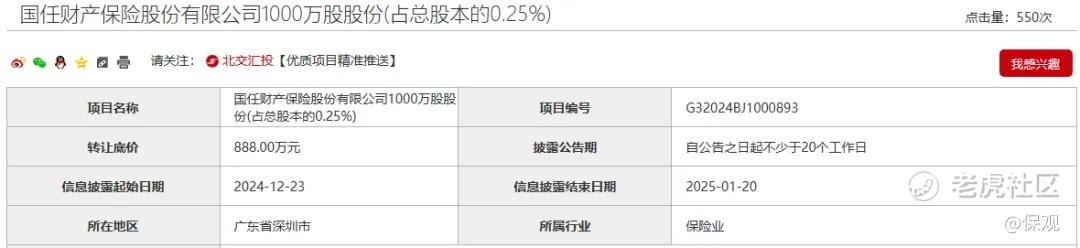 首先是国任保险的1000万股股份(占总股本的0.25%)由北京汽车集团产业投资有限公司(北汽产业投资)在北京产权交易所公开挂牌转让,转让底价为888万元。