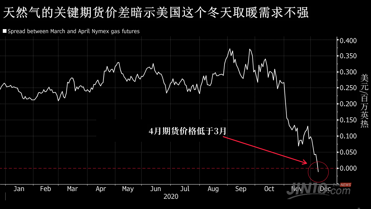 截至本周二,美国的3月和4月天然气期货价差暴跌至了零。这个利差对于判断北美这个冬天的能源供应情况至关重要。这也是2015年以来第一次同期价差跌至如此低的水平,表明交易商们预测今年冬天美国气候温和,将打压能源需求。