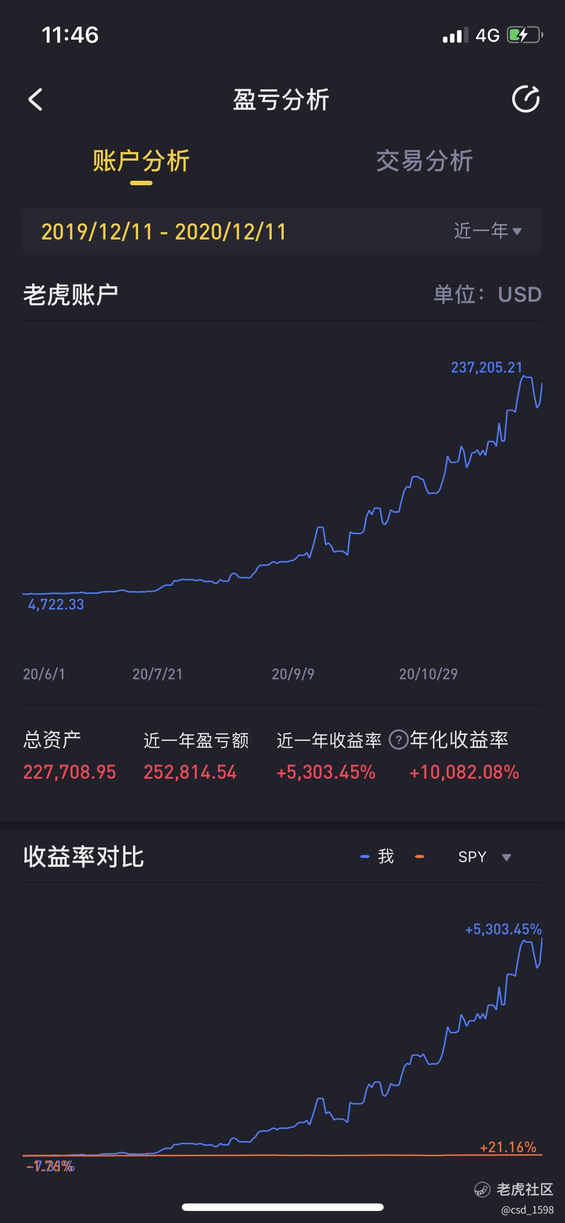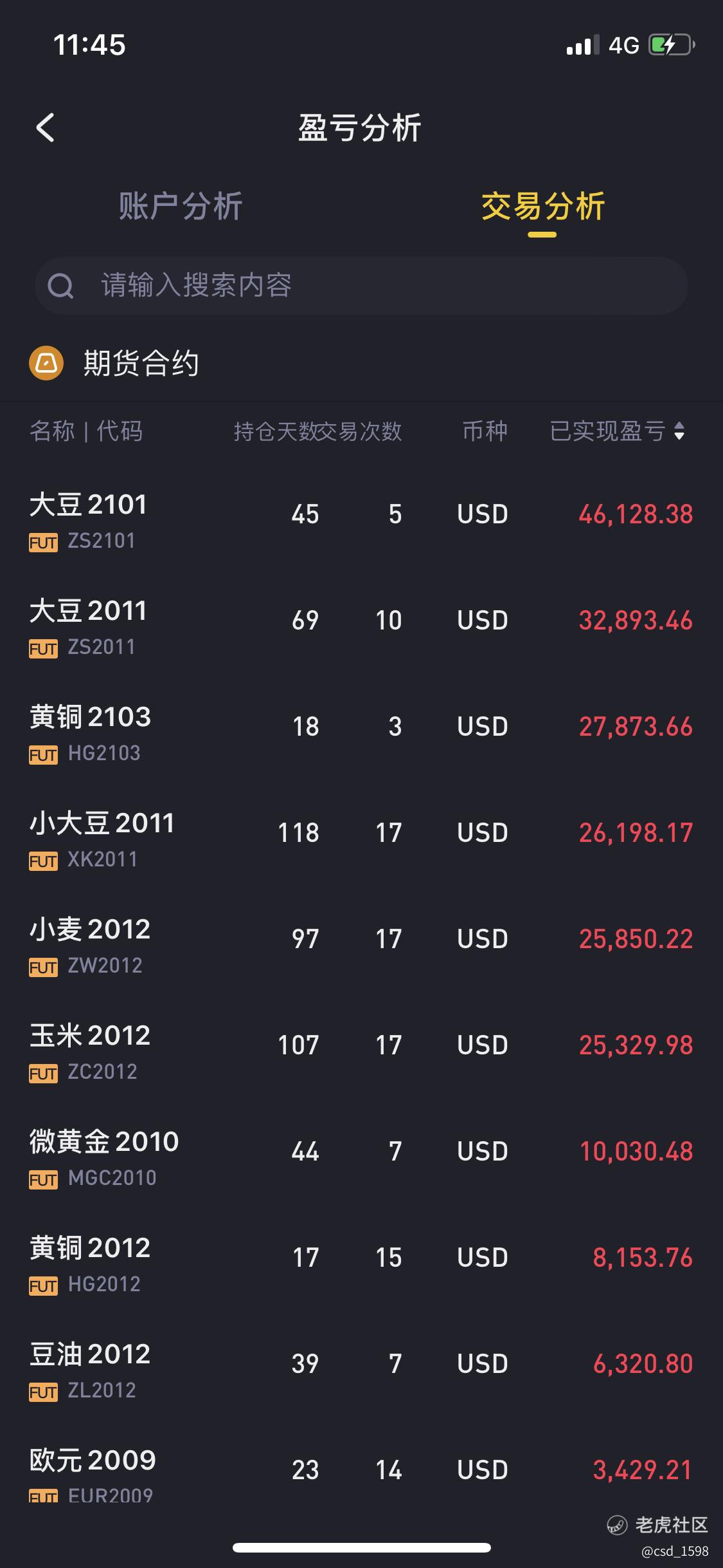 从图可以看出这个老虎账户收益源主要来源于今年下半年开始的农产品行情,主要是大豆,8月开始起涨,牢牢的抓住了一大波。农产品这个产品其实是个奇葩,很容易爆涨或者爆跌,个人感觉都是美国农业部在操纵,想他涨就涨,📉就跌,毕竟交易所都是人家开的,大家觉得有道理不[呆住]