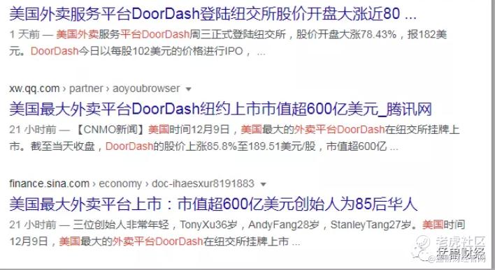 打开搜索引擎,搜索关于DoorDash的信息,网上几乎一边倒的全都是对美国外卖平台DoorDash的溢美之词,随便点开几个看了下,大部分都是DoorDash创造了今年以来美股最大的IPO之一、股价暴涨,三个华人都成了亿万富翁等内容,好像除了这几个就没有别的观点了,好像这些互相不认识的媒体都是商量好了一样,都在异口同声的传播类似的观点,也不知道是在跟风还是咋回事。