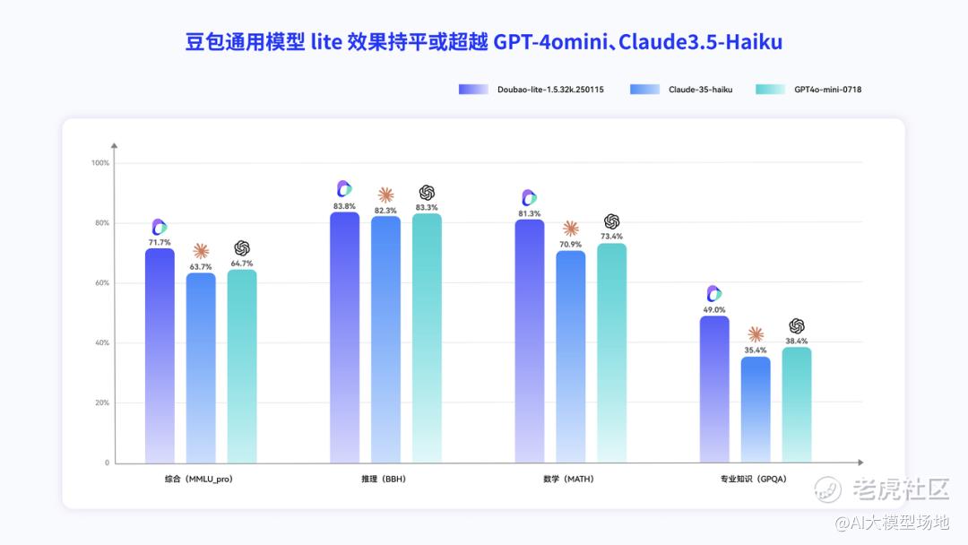 除了“不偏科”的Doubao-1.5-pro外,轻量级Doubao-1.5-pro表现也不逊色,在轻量版语言模型中也处于全球一流水平,在综合、推理、数学、专业知识权威测评指标持平或超越GPT-4omini,Cluade 3.5 Haiku。