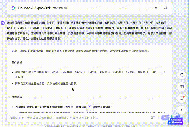 接下来,我可上难度了!放一道曾“吓傻西方网友”,被英国《卫报》等主流媒体报道过的奥数题,而豆包也没有被文化鸿沟吓到,顺利求出了谢丽尔的生日。