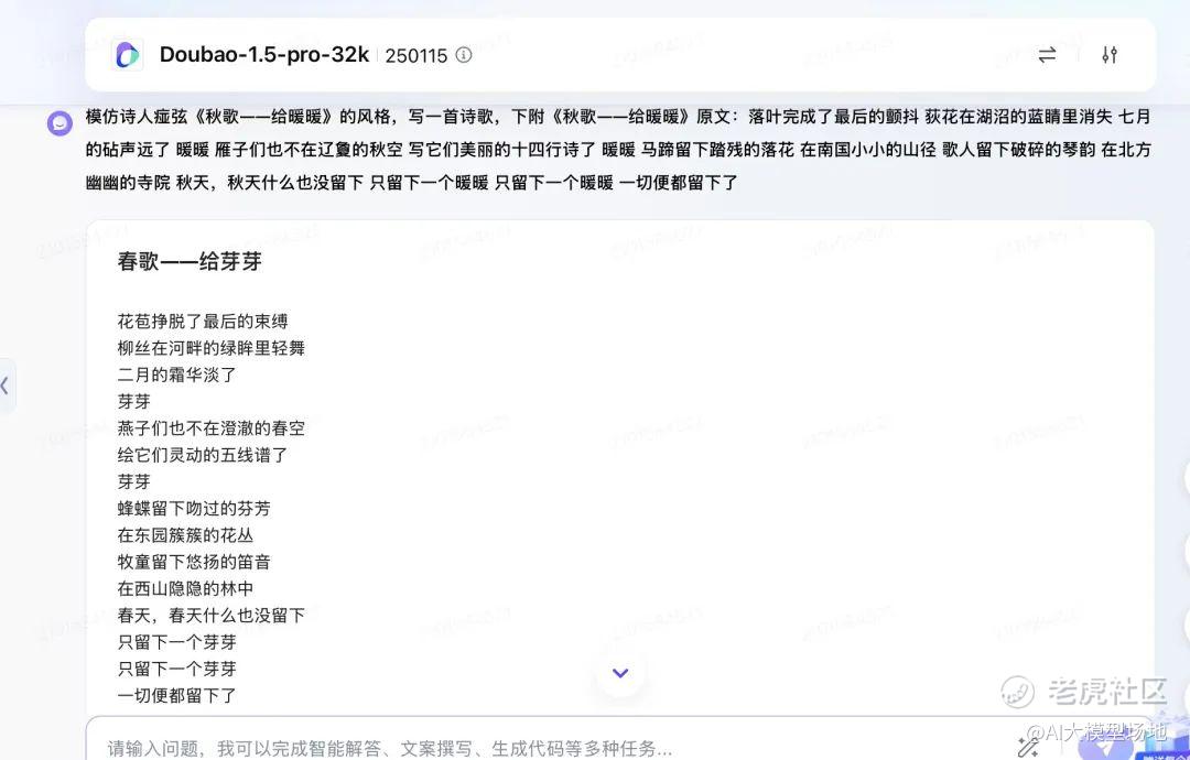 那么,写当代诗的水平如何?让其模仿痖弦《秋歌——给暖暖》写一首当代诗,豆包非常上道,写了一首《春歌,给芽芽》: