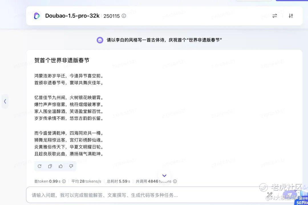 数学能力这么好,那么在“主场作战”的中文领域,豆包表现如何呢?春节将近,让豆包用李白的风格写一首诗,庆祝首个“世界非遗春节”:
