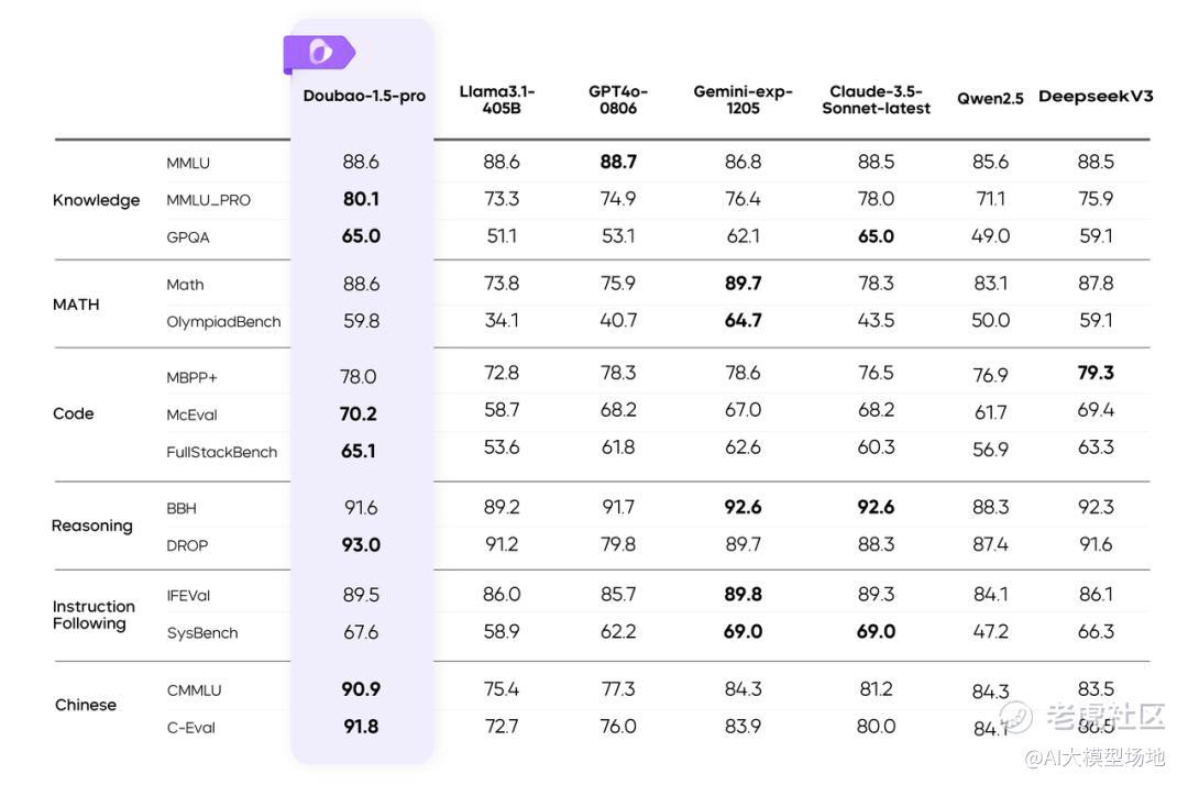 据多个公开评测基准对豆包通用模型pro(Doubao-1.5-pro)的性能评估,Doubao-1.5-pro 在知识、代码、推理、中文权威测评基准上获得最佳成绩,综合得分优于GPT4o、Claude 3.5 Sonnet等业界一流模型,在中文处理和特定领域知识方面优势明显。