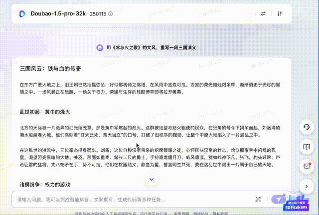 接下来,上难度了!让豆包用西方史诗作品《冰与火之歌》的文风改写《三国演义》,效果惊艳,中国古典名著分分钟爆改西方中世纪文学,诸侯纷争秒变“权力的游戏”,“汉家的荣光如残阳余晖……一场关于权力、荣耀与生存的残酷博弈即将拉开帷幕。”