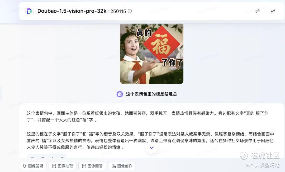 上传一张图片、文字多维度玩梗的复杂表情包,豆包也能分分钟理解,讲清楚玩了哪些图片梗和谐音梗: