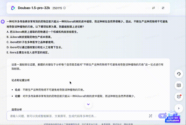接下来,上一道削弱论证题,解题的关键在于分析每个选项能否对论点进行有效削弱,这也难不倒豆包: