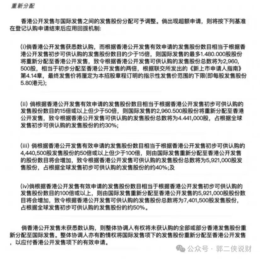 4、公开发售认购倍数大于100倍,启动回拨比例至50%。公开发售占比50%,国际发售占比50%。