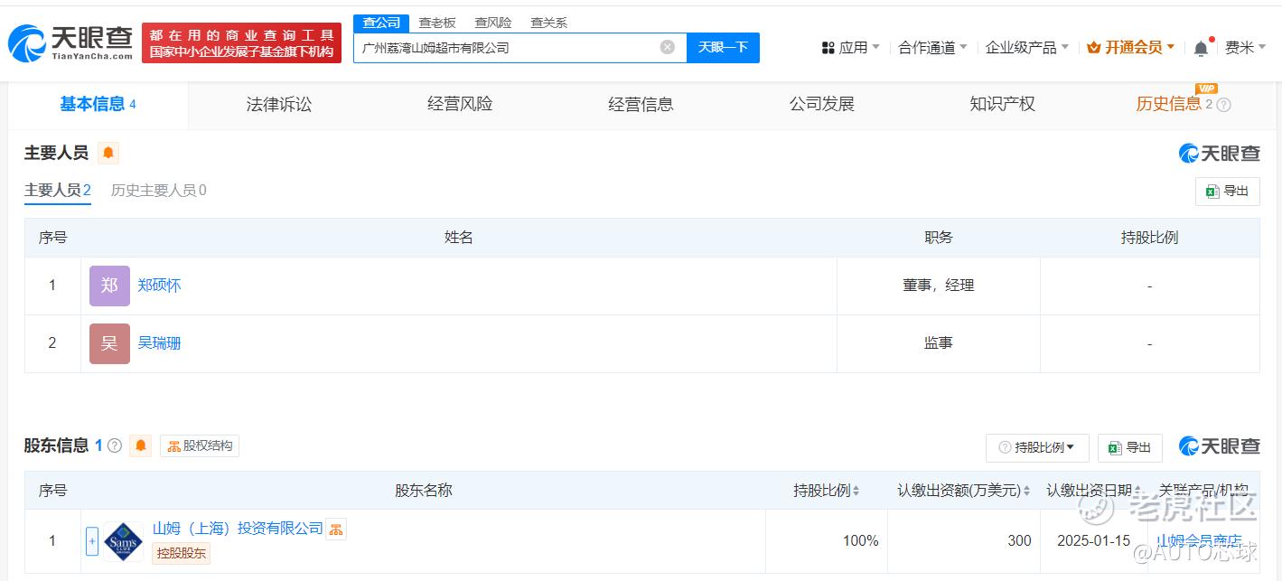 天眼查App显示,近日,广州荔湾山姆超市有限公司、扬州山姆超市有限公司成立,法定代表人均为郑硕怀,注册资本均为300万美元,经营范围均包含食品销售、出版物零售、第三类医疗器械经营、餐饮服务等。股东信息显示,上述两公司均由山姆(上海)投资有限公司全资持股。