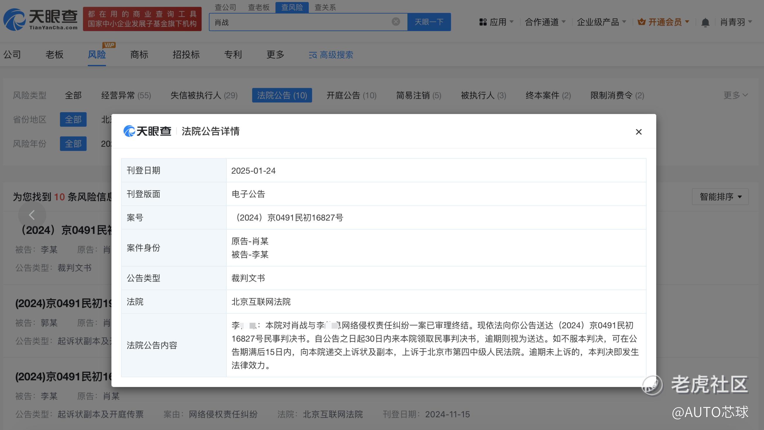 天眼查法律诉讼信息显示,近日,北京互联网法院向李某某公告送达肖战与其网络侵权责任纠纷一案民事判决书。自公告之日起30日内来本院领取民事判决书,逾期则视为送达。如不服本判决,可在公告期满后15日内,向本院递交上诉状及副本,上诉于北京市第四中级人民法院。逾期未上诉的,本判决即发生法律效力。