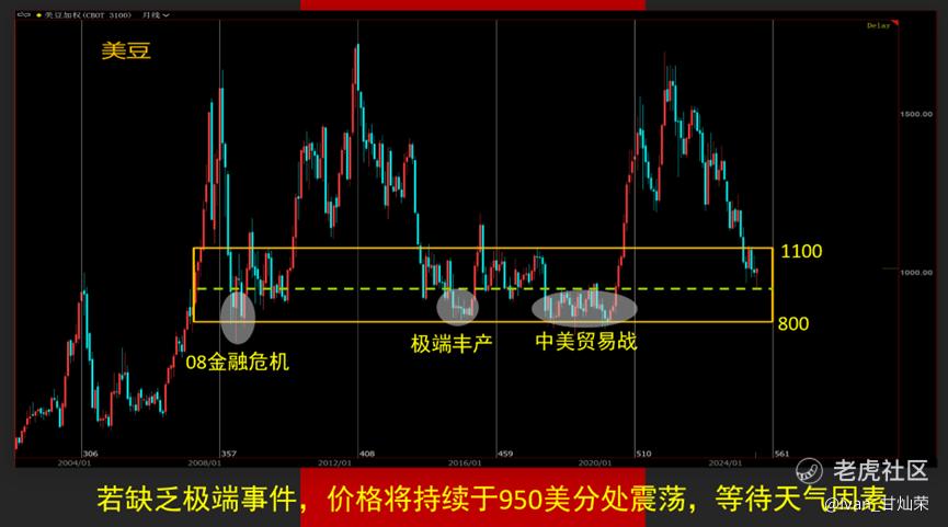 农产品除小麦外,最近的大幅反弹均由于价格低于成本价之下所导致。成本价对农产品价格素来有支撑作用,只不过支撑不代表能够就此上涨,毕竟库存并不算低,没有“抢货”的契机,那农产品的走势将是较为长期的震荡市,时长半年至两年不等,主要视乎库存消化情况而定。而当下以美豆为首的农产品,其价格正处于长期底部的震荡区间中,目前是最消耗耐心的时候。美豆800-1100是历史上美豆价格的底部区间,具有很强参考意义,有效突破该区间,则说明农产品整体行情或来临,不然的话还是震荡较多。