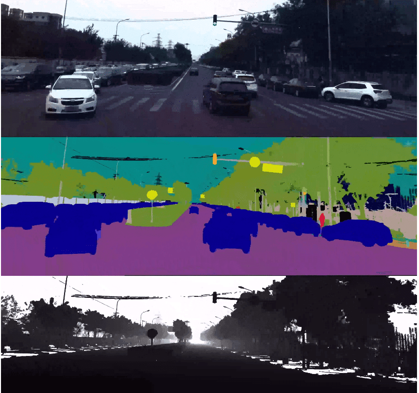 分割后的图像(如下图的彩色部分所示)可以标注26种分类,包括汽车,行人,自行车,建筑物和路灯,以帮助自动驾驶汽车识别道路上的可驾驶区域作为检测即将到来的危害。