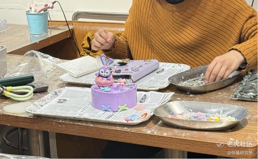 “店内的活动很丰富,做出来的东西也很精致,就是价格不算便宜。4个自制的奶油胶发卡要50多元,一条卡通皮绳大概90元,一个手机壳就超过150元,我和朋友在大众点评上看了半天,最后决定做一个首饰收纳盒,既实用又划算。”小绮告诉惊蛰研究所,“制作时,小件配饰可以随意搭配,大件则需要额外收费。DIY的过程中,店员也会耐心指导和帮忙修正,整个过程非常有趣。”