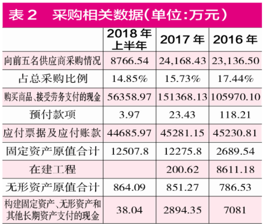 此外,若结合这两年一期的固定资产原值、在建工程、无形资产原值的增减情况看,2017年和2018年上半年,这几项之和分别为13327.69万元和13371.89万元,其中2018年上半年在建工程数据未披露,而2016年没有公布固定资产原值和无形资产原值,只披露了减值后数据分别为2689.54万元和786.53万元,再加上当期在建工程为8611.18万元,那么三项之和至少为12087.25万元,即可推算出2017年固定资产原值等三项资产最多新增了1240.44万元。而2017年和2018年上半年构建固定资产、无形资产和其他长期资产支付的现金分别为2894.35万元和38.04万元。将这三项之和与现金支出相减,2017年和2018年上半年分别为-1653.91万元和6.16万元。也就是说,2017年应付款项至少应减少了1653.91万元,而2018年上半年应付款项则会新增6.16万元。如此看来,即使考虑固定资产原值等三项支出的影响,仍无法解释这两年采购数据1.9亿元和9744.42万元差异的。总之,公司采购方面数据的真实性也是值得怀疑的。