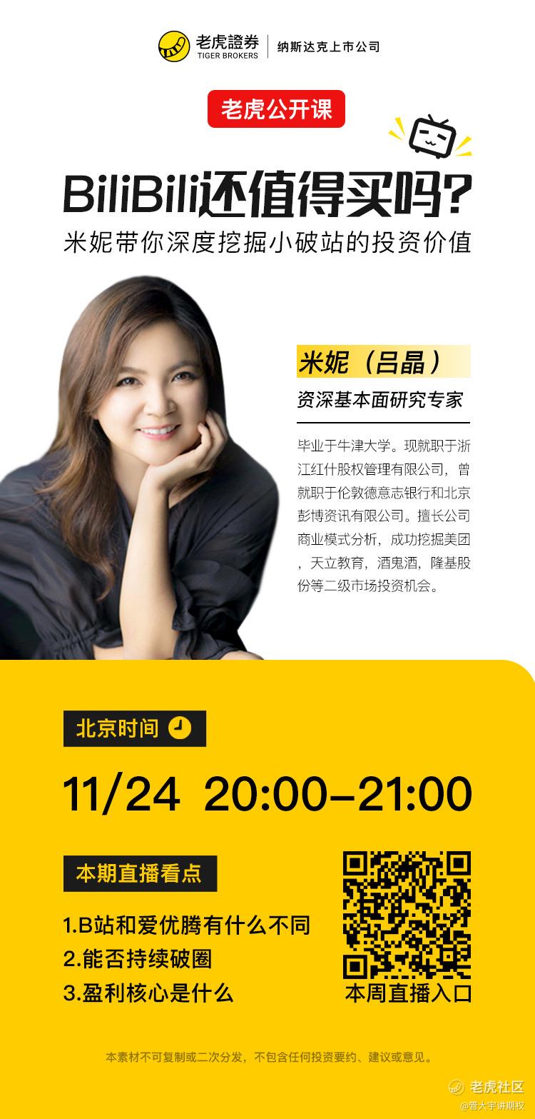 11月24日(下周二)晚8点直播间,资深基本面专家——米妮,带你深度挖掘B站投资价值,点击下方图片了解详情。