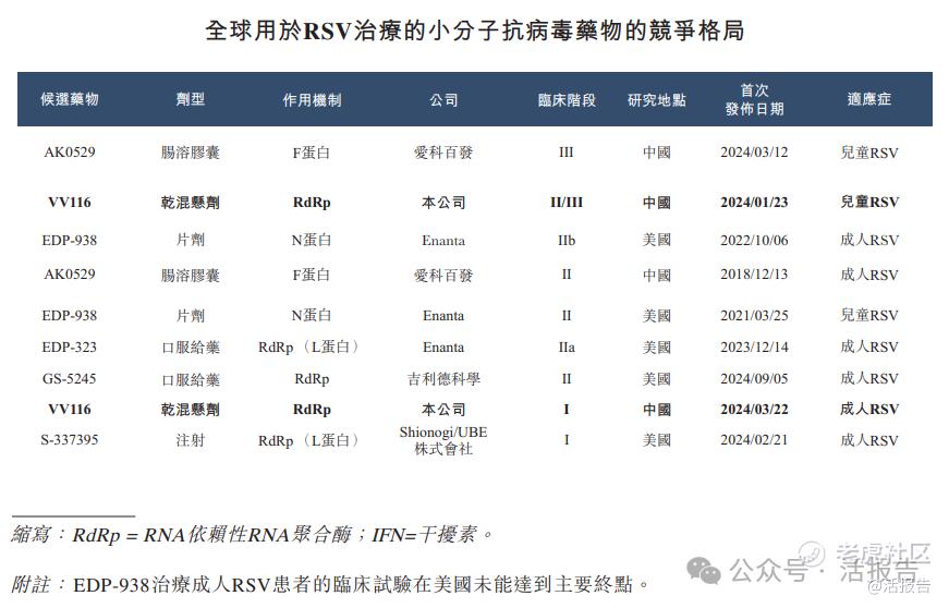 截至最后实际可行日期,全球尚无治疗RSV的创新小分子抗病毒疗法获批。在中国,用于RSV治疗的两款小分子抗病毒候选药物正在开发中,VV116乃唯一一款靶向RdRp的候选药物。截至最后实际可行日期,VV116干混悬剂亦是唯一一款为婴幼儿方便给药而设计的干混悬剂型,其处于II/III期临床试验阶段。