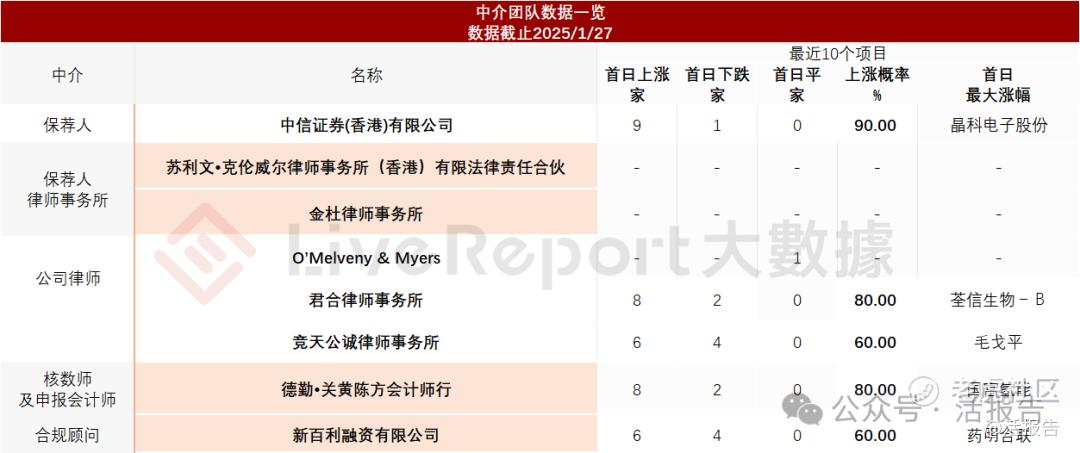据LiveReport大数据统计,旺山旺水中介团队共8家,其中保荐人2家,近10家保荐项目数据有突出的【中信证券香港】;公司律师共计3家,这个组合数据体现中等偏上。总体而言,这个组合团队表现尚可。
