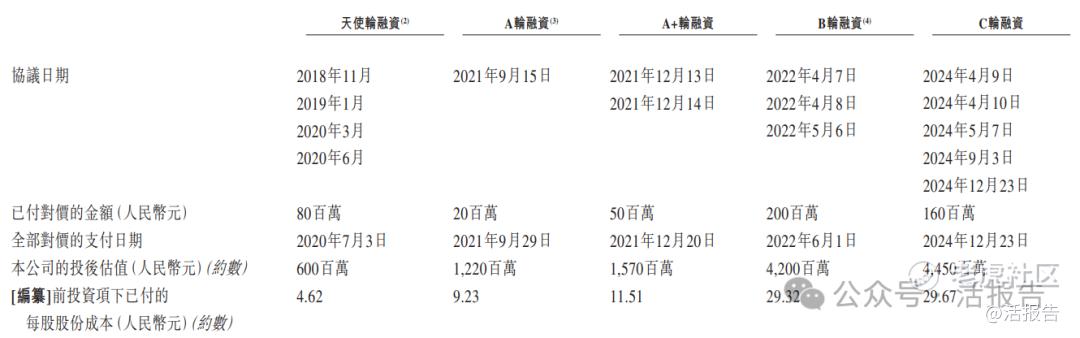 公司上市前经历了5轮融资,累计融资5.1亿元人民币。在C轮最新融资中,公司融资1.6亿元,投后估值约为44.5亿元(47.8亿港元),对应每股成本概约为29.67元。