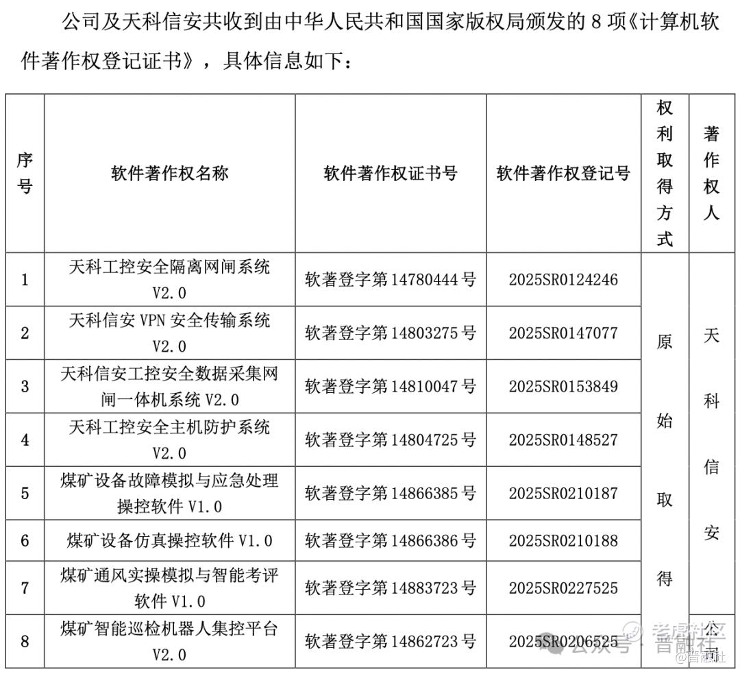 两项发明专利分别为巡检小车防脱轨坠落装置、脱轨保护巡检机器人,软件著作权涉及煤矿智能巡检机器人集控平台、煤矿设备故障模拟与应急处理操控软件等。